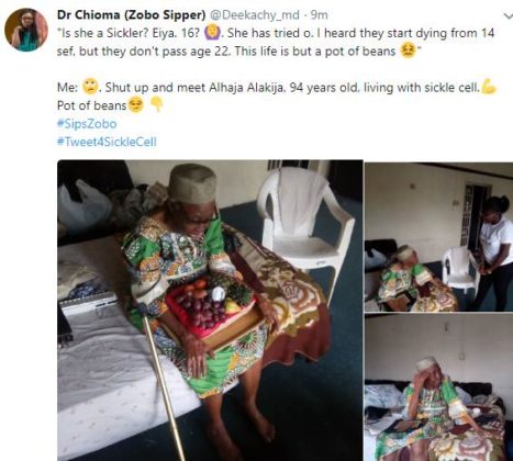 Nigerian doctor, Chioma @Deekachy_md, shared the photos of the elderly woman, Alhaja Alakija, who according to her has lived with sickle cell anemia for 94 years.