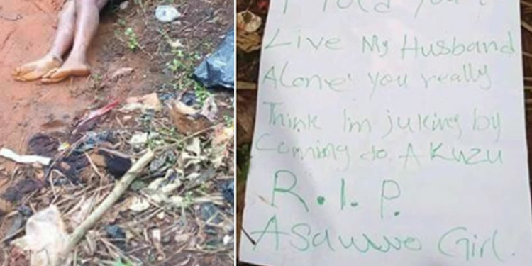 The body of Ada Ezeudo, from Mgbuke Umunnachi in Dunukofia, Anambra state, was found along a dusty road with her handbag and a note close by.