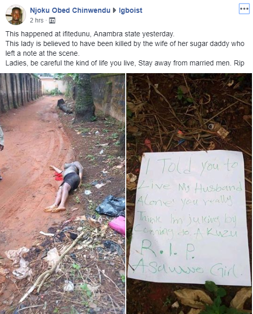 The dead body of a woman was found in the middle of the road in Ifitedunu, Anambra state, and it is believed she was killed by the wife of a man she was having an affair with.