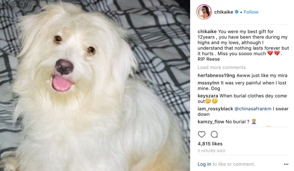 Nollywood Actress, Chika Ike has been thrown into mourning following the death of her beloved dog,Reese..She revealed the pup had been with her for 12 years.