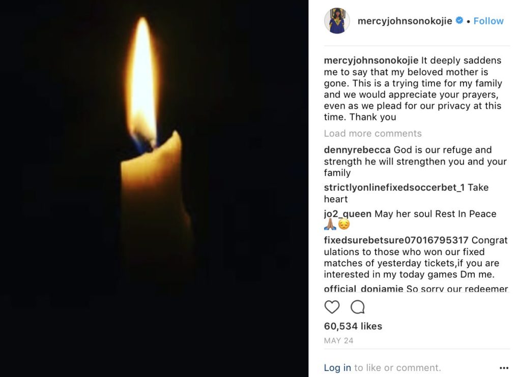 Mercy Johnson made this known on her Instagram account where she pleaded for privacy as well as prayers from her fans.Mercy Johnson’s hasn’t posted any photo since then.