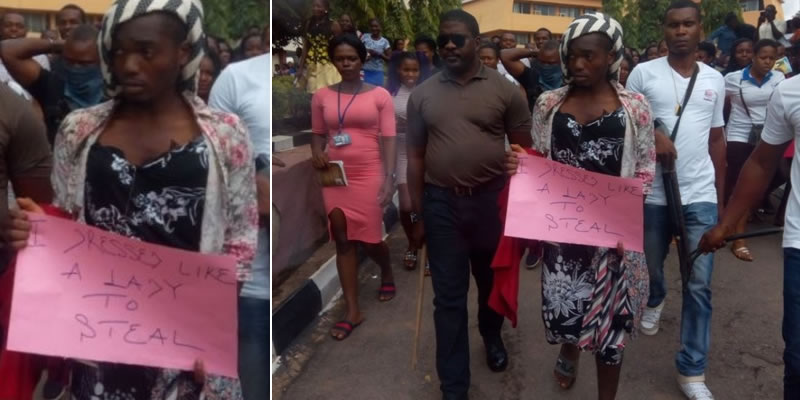 He was caught in the act and was paraded by the school’s Anti Cult Squad. As he was paraded, he was made to hold a placard that reads: “I dressed like a lady to steal.”