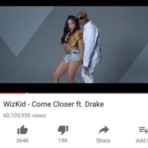 Starboy Wizkid’s ”Come Closer” hits 60m views on Youtube and the singer will be grateful to his fans for their support.
