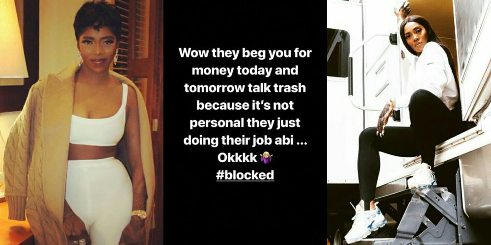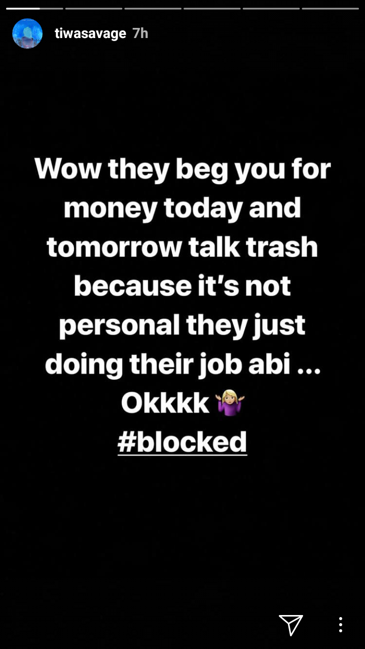 Wow they beg you for money today and tomorrow talk trash because it’s not personal, they just doing their job abi… okay blocked. Celebrities are human. You can’t beg for money then talk trash and expect me not to catch feelings.