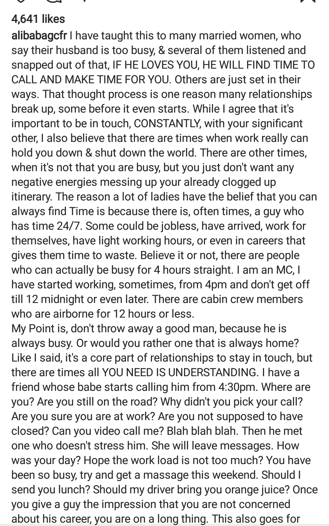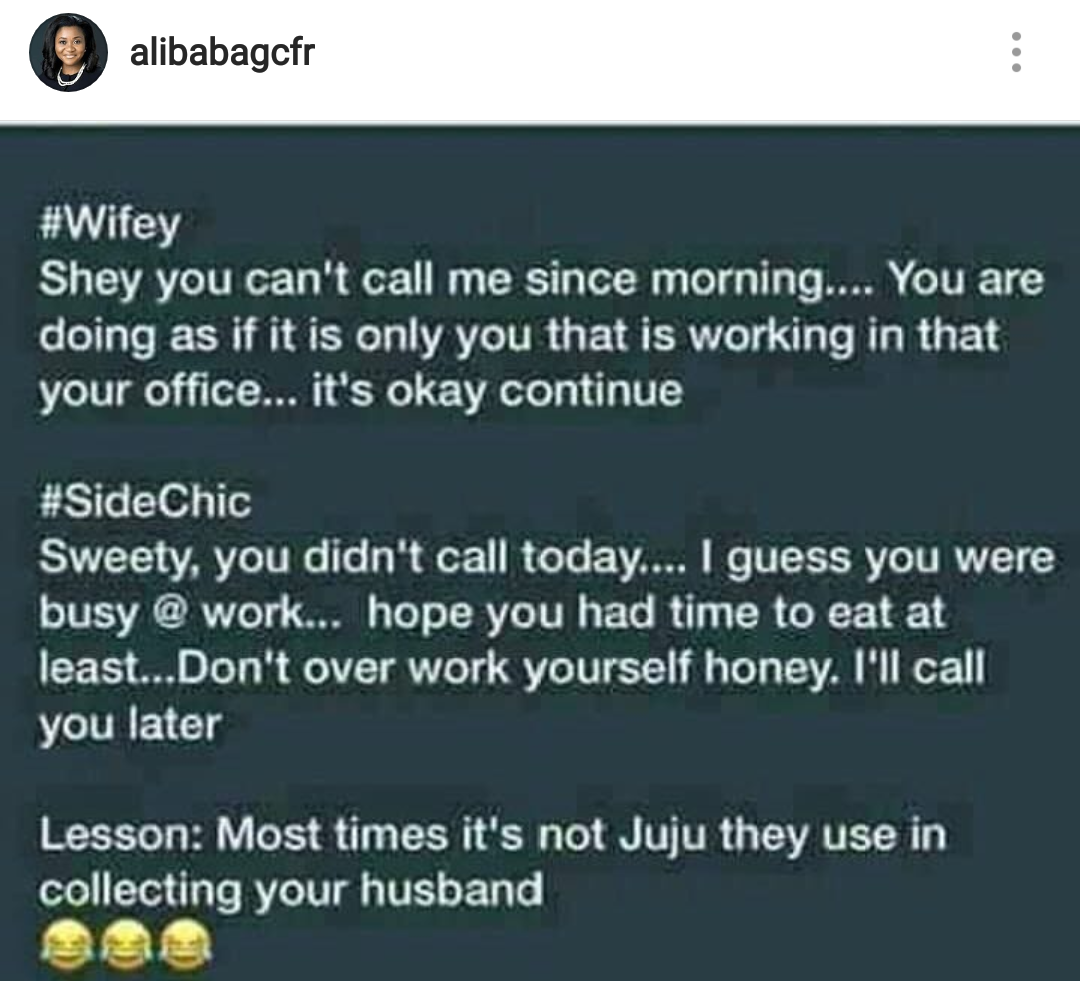 Writing an interesting piece on sidekicks versus wives in the lives of men, Alibaba who just recently wished his wife a happy 50th birthday, used an illustration of how a wife vs a side chick reacts to a busy spouse.