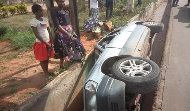 Mother and daughter miraculously survive crash as car somersaults, plunges into drainage in Anambra