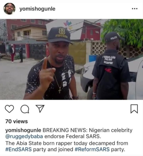 Yomi Shogunle shared a photo of Ruggedman with a Federal SARS officer and alleged that Ruggedman, who has been very vocal in his call to end SARS, has now turned around to join those calling for SARS to be reformed rather than to be scrapped.