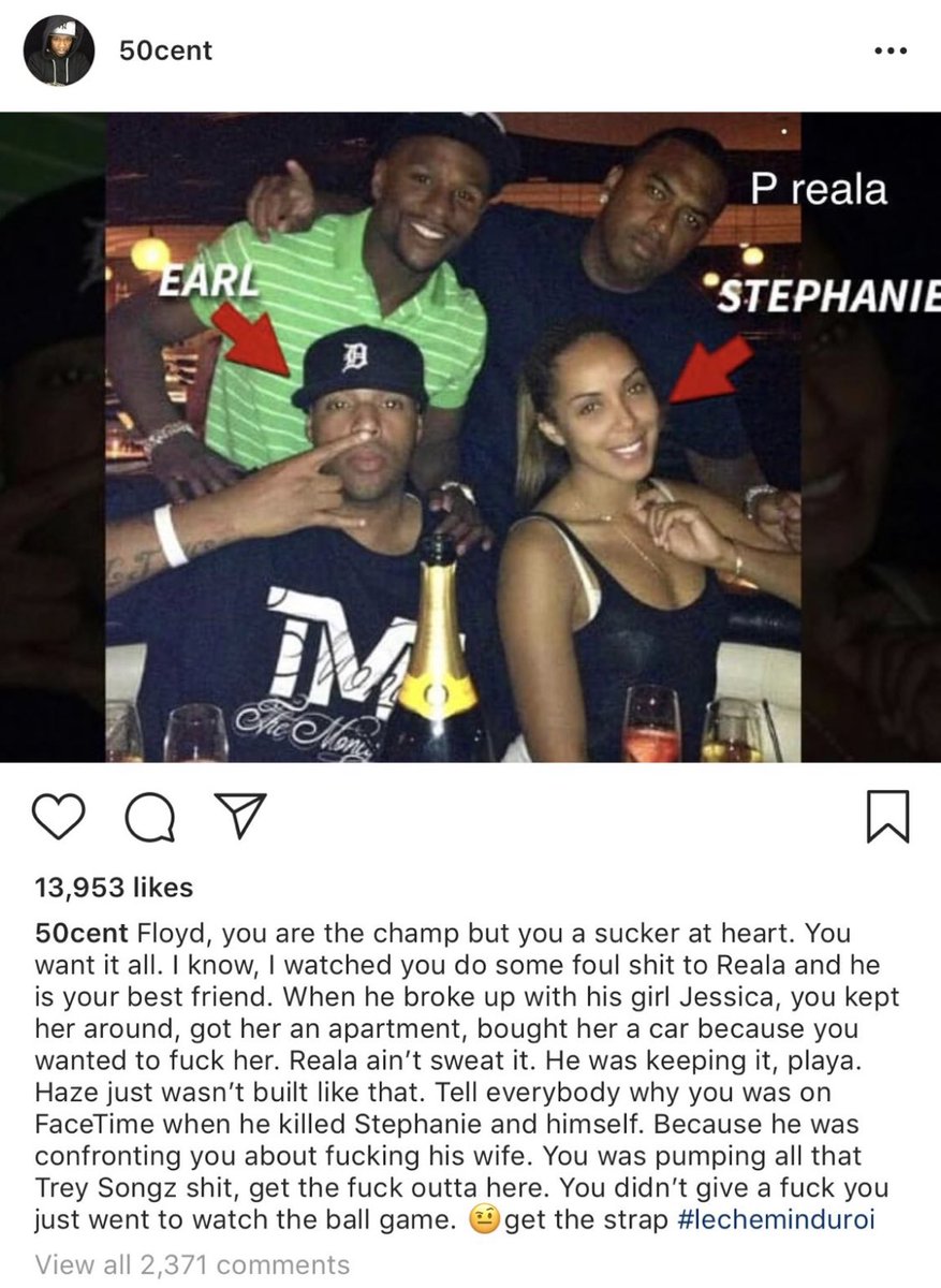 50 also claimed Floyd did same thing to the girlfriend of his other friend, P-Reala, by sleeping with his girlfriend after their break up as well, and allegedly buying her a car and paying for her apartment.