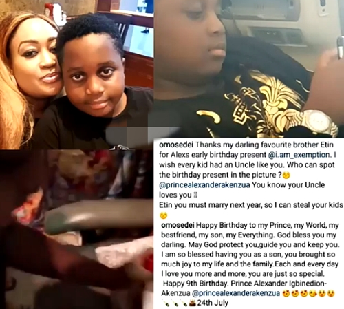 “Thanks my darling favourite brother Etin for Alexs early birthday present @i.am_exemption. I wish every kid had an Uncle like you. Who can spot the birthday present in the picture ? @princealexanderakenzua You know your Uncle loves you. Etin you must marry next year, so I can steal your kids.”