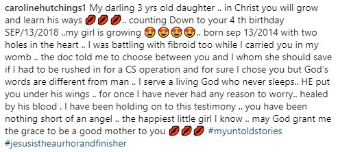 “My darling 3 yrs old daughter .. in Christ you will grow and learn his ways ???.. counting Down to your 4 th birthday SEP/13/2018 ..my girl is growing ????.. born sep 13/2014 with two holes in the heart .. I was battling with fibroid too while I carried you in my womb .. the doc told me to choose between you and I whom she should save if I had to be rushed in for a CS operation and for sure I chose you but God’s words are different from man .. I serve a living God who never sleeps.. HE put you under his wings .. for once I have never had any reason to worry.. healed by his blood . I have been holding on to this testimony .. you have been nothing short of an angel .. the happiest little girl I know .. may God grant me the grace to be a good mother to you ??? #myuntoldstories#jesusistheaurhorandfinisher