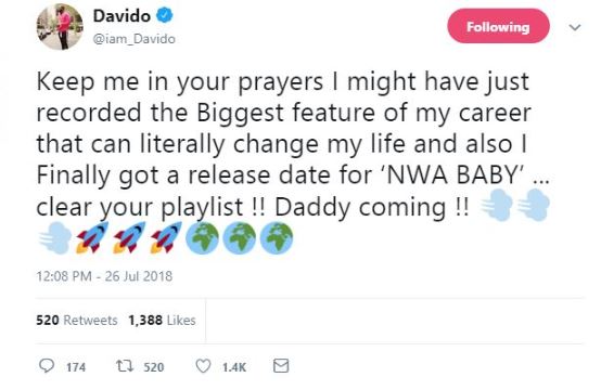 “Keep me in your prayer I might have just recorded the biggest feature of my career that can literally change my life and also I finally got a release date for ‘NWA BABY’… clear your playlist!! Daddy coming!!” he posted on Twitter.