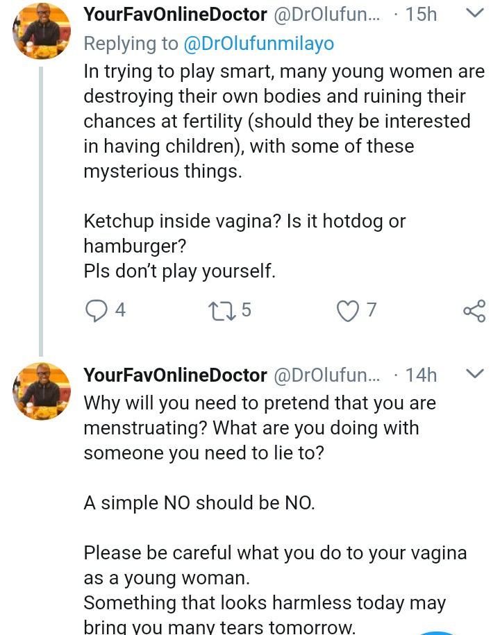 A popular Nigerian doctor has taken to social media platform, twitter, to warn ladies against the use of ketchup to fake menstrual period.