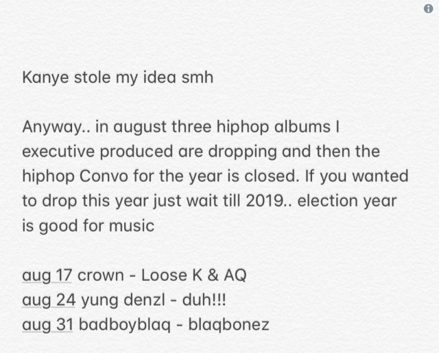 “Kanye stole my idea smh. Anyway.. in august three hiphop albums I executive produced are dropping and then the hiphop Convo for the year is closed. if you wanted to drop this year just wait till 2019.. election year is good for music.”