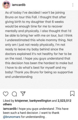The singer was quite understanding and supported her decision to focus on her baby. He also sent his love to baby Kulture and promised that Cardi’s hit “Bodak Yellow” will be played every night in her honor.