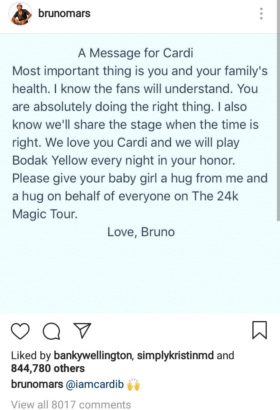 Bruno Mars has reacted to Cardi B’s announecement that she will not be going on tour with him as planned.