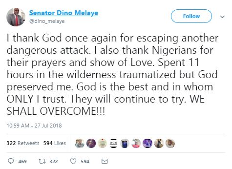 The senator tweeted this morning that he escaped from the kidnappers as he thanked God for sparing his life.