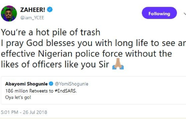 ‘You’re a hot pile of trash I pray God blesses you with long life to see an effective Nigerian police force without the likes of officers like you sir’.