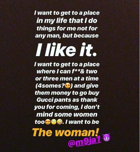 I want to get to a place where I can f*** two or three men at a time (4somes?) and give them money to go buy gucci pants as thank you for coming, I don’t mind some women too. I want to be the woman