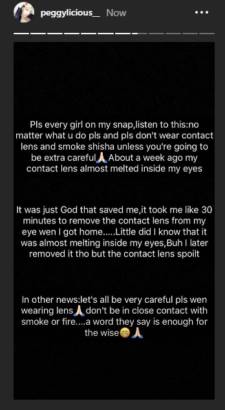 A Nigerian lady who almost went blind for smoking shisha while wearing contact lens, has taken to her Instastory to warn ladies on dangers of doing such.