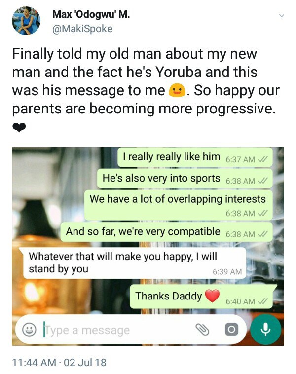 A US-based Nigerian Strategy Consultant, Max Odogwu from Anambra State shared a message that her father sent after she finally revealed that her new man is Yoruba.