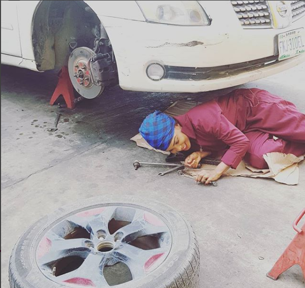 The 40-year old single mother look fit for the job in the track suit worn by her on set as she got under vehicles as if she has a prior experience of fixing vehicles.