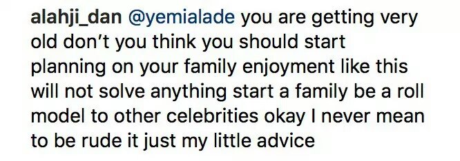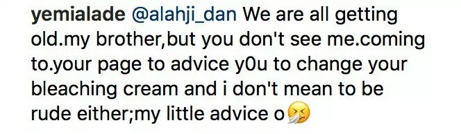@alahji_dan We are all getting old.my brother,but you don’t see me.coming to.your page to advice y0u to change your bleaching cream and i don’t mean to be rude either;my little advice o