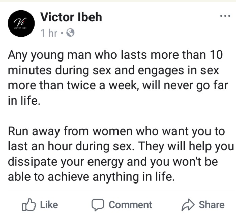 According to his post on Facebook, any man who Engages in sexual Intercourse for more than 10mins won’t go far in life and also anyone who Engages in sex more than twice a week.