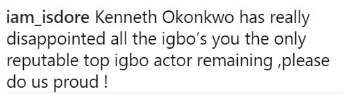 “Kenneth Okonkwo has really disappointed all the igbo’s you the only reputable top igbo actor remaining ,please do us proud !”.