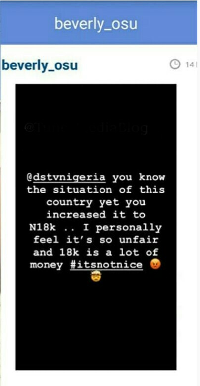 Former Big Brother Africa housemate, Beverly Osu has gone weak at the knees over the recent hike in the tarrif for DSTv subscribers. She lashed at the South African owned company for not having mercy on Nigerians like her who are currently going through economic recession.