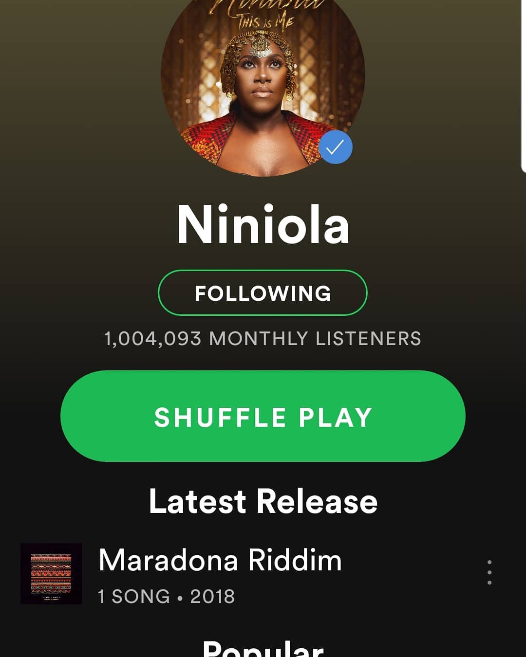 Niniola makes history today with over 1million listeners on Spotify, making her the first female Nigerian artiste ever to cross the 1million mark.