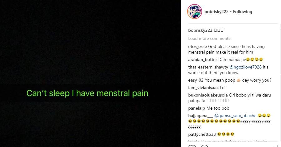 Nigerian self-acclaimed male barbie,Okuneye Idris a.k.a Bobrisky has taken to his Instagram page early this morning to reveal to his fans that he has been unable to sleep because he is having menstrual pain.