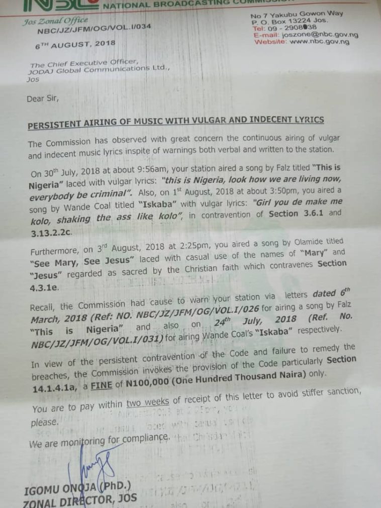 “On 30th July, 2018 at about 9:56am, your station aired a song by falz titled “This is Nigeria” laced with vulgar lyrics: “this is Nigeria, look how we are living now, everybody be criminal”.