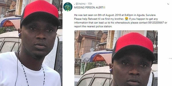 A Nigerian lady, Jumoke, is calling for help to locate her brother, Hakeem Sanusi (pictured below), who has been missing since August 8th 2018. He was last seen in Aguda, Surulere.
