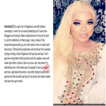 Popular cross dresser Bobrisky has threatened to beat up any Nigerian blogger and journalist who prey on him at events just to take unflattering shots of him for their readers.