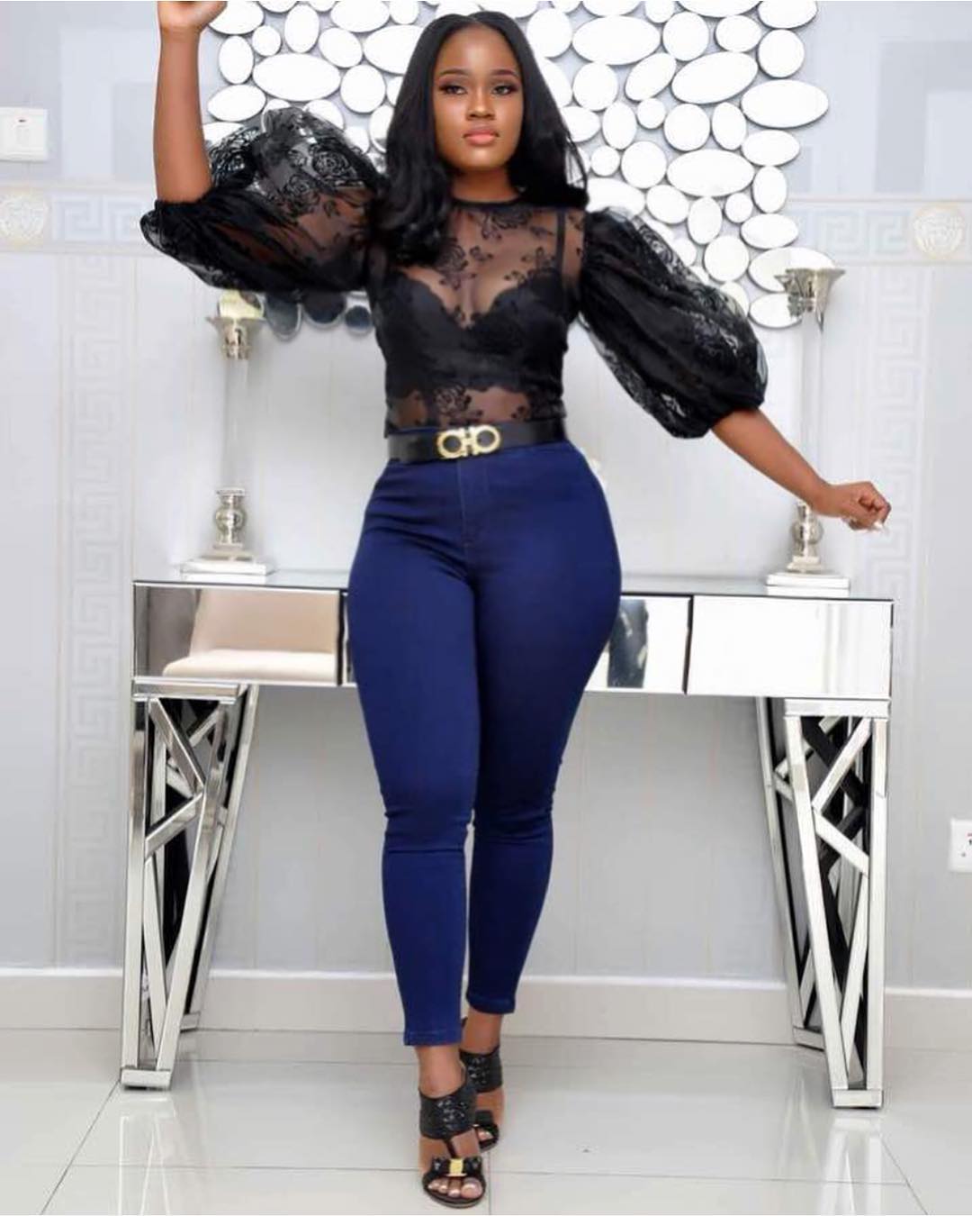 Former Big Brother Naija housemate, Cynthia Nwadiora aka Cee-C who looks extremely gorgeous in this new photo she shared, flaunts her curves in a figure-hugging jeans, which she paired with a see-through top.