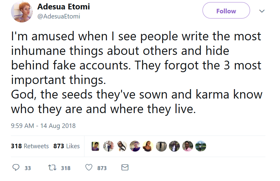 Actress, Adesua Etomi-Wellington has taken to her twitter handle to pen down a message addressed to cyberbullies who hide behind fake account.
