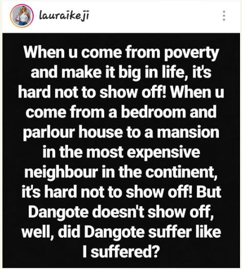 When u come from poverty and make it big in life, it’s hard not to show off! When u come from a bedroom and parlour house to a mansion in the most expensive neighbourhood in the continent, its hard not to show off! But Dangote doesn’t show off, well did Dangote suffer like I suffered?”