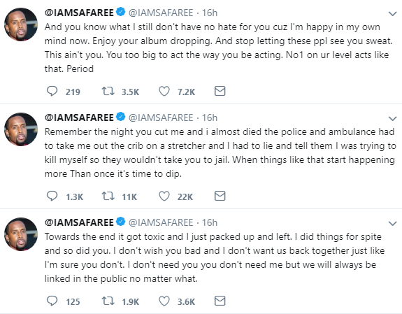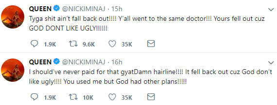 The fight then continued on Twitter after the interview aired. On Twitter Safaree accused Nicki of being violent towards him and unfaithful during their relationship, Nicki accused him of stealing from her and revealed that his hairline is fake and it was paid for by her.