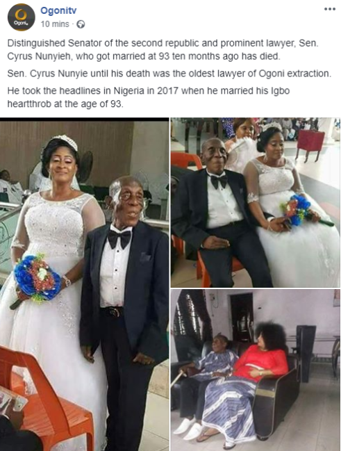 88-year-old former senator, Cyrus Nunyieh dies months after marrying a much younger bride