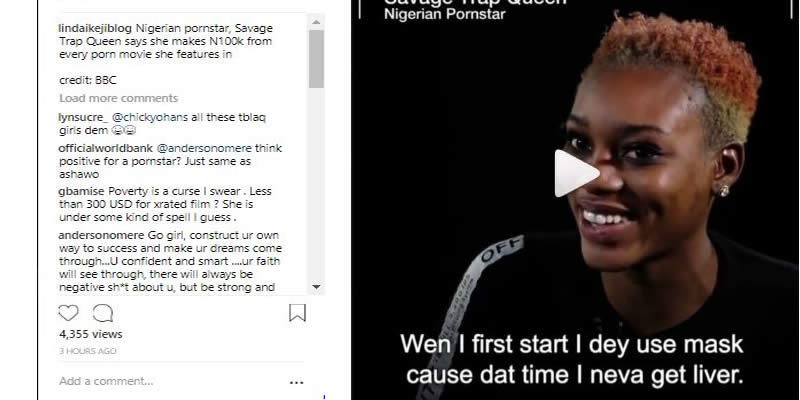 In an interview with BBC Pidgin English, Nigerian pornstar, Savage Trap Queen, says she makes between N80,000 to N100, 000 every month. She says she is proud of her body and likes to show it off. According to her, her mother is aware of her kind of business and loves her like that.