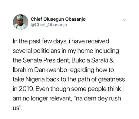 In a tweet posted a while he ago he wrote “In the past few days, I have received seeral politcians in my home including the Senate President, Bukola Saraki and Ibrahim Dankwanbo regarding how to take Nigeria back to the path of greatness in 2019. Even though some people think I am no longer relevant, “na dem rush us”