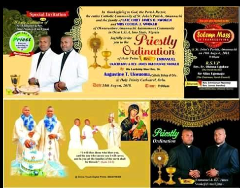 On Saturday, August 18th (yesterday), history repeated itself as a set of identical twins were ordained Catholic priests in Orlu Diocese, Imo state. as another Twins emerges a full Catholic ordained priests.