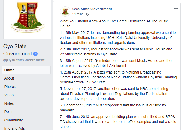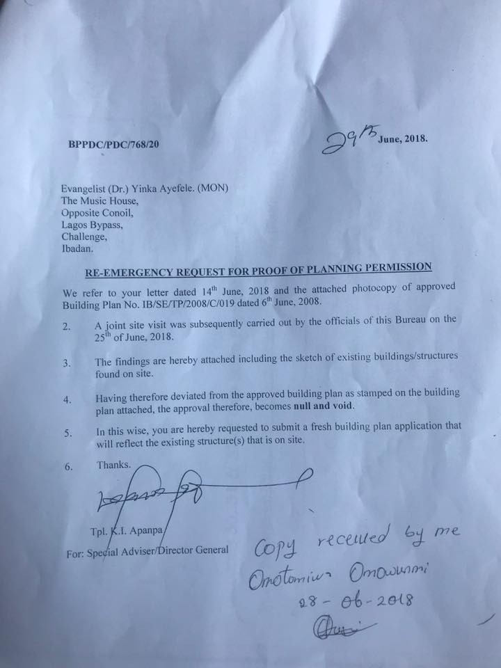 However, late Monday evening, the Special Adviser to Governor Abiola Ajimobi on Physical Planning and Development Control, Mr. Waheed Gbadamosi, claimed at a press conference in Ibadan that government gave ample opportunity for Music House to regularise its building plan.