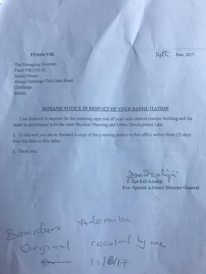 4. 25th August 2017 A letter was sent to National Broadcasting Commission titled Operation of Radio Stations without Physical Planning permit/Aprroval in Oyo State.