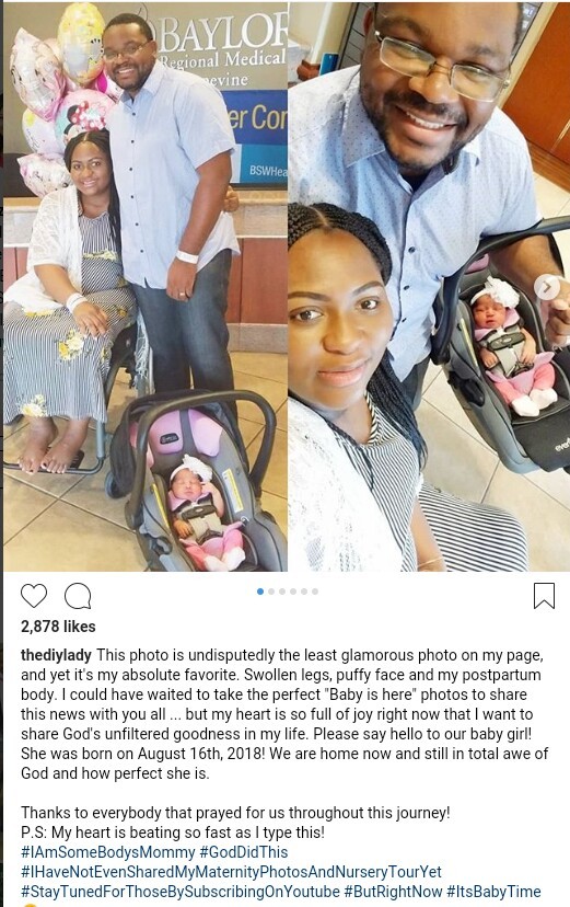 “This photo is undisputedly the least glamorous photo on my page, and yet it’s my absolute favorite. Swollen legs, puffy face and my postpartum body. I could have waited to take the perfect “Baby is here” photos to share this news with you all … but my heart is so full of joy right now that I want to share God’s unfiltered goodness in my life. Please say hello to our baby girl! She was born on August 16th, 2018! We are home now and still in total awe of God and how perfect she is.