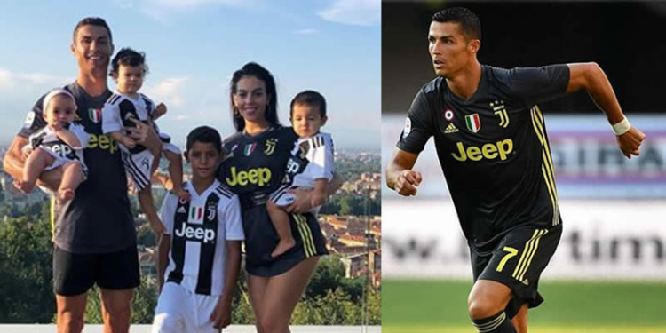 Superstar footballer, Cristiano Ronaldo who joined Juventus from Real Madrid in July, shared this adorable family photo with all children, Cristiano Ronaldo Jr ,8, twins Mateo and Eva, 1, Alana, 9months, and his partner Georgina Rodriguez, showing off his club’s home and away jerseys