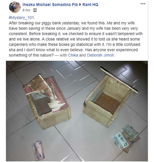 The husband, Iheaka Michael Somadina Flb took to Facebook to reveal they found N240 (Two pieces of hundred naira note & Two pieces of twenty naira note) in the piggy bank they were keeping money in since January this year.
