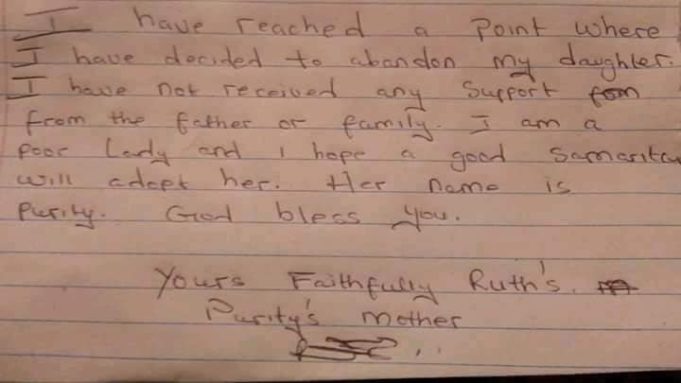 The note the lady left behind, reads: “I have reached a point where I have to abandon my daughter. .