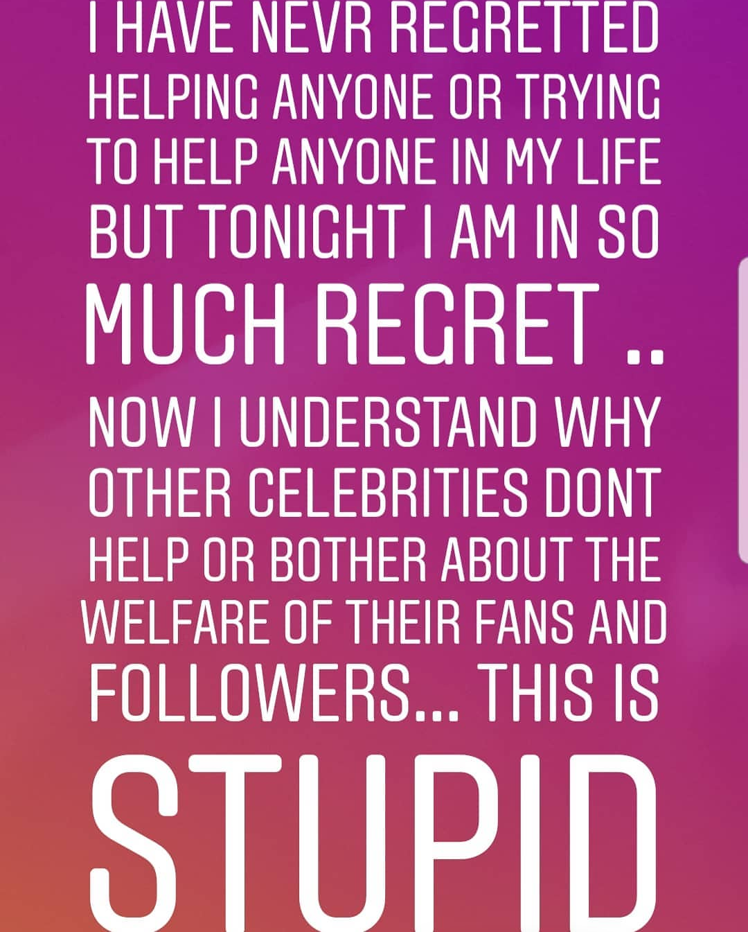 The mother of one says she now understands why most celebrities do not help fans. She however told her P.A to adress all unpaid promises.