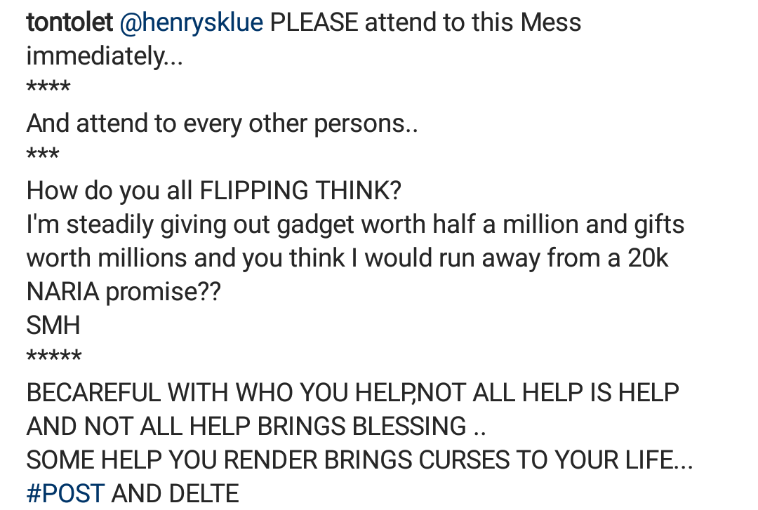 The actress revealed her anger saying the fan claims she is trying to bail out of a promised N20,000.